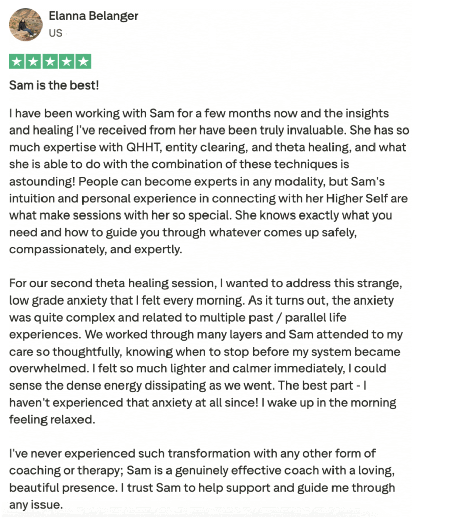 Sam led a Theta Healing session for me. She clearly explained the process which helped me feel very comfortable. I also felt more confident about the topic I had wanted to focus on. During the session, she skillfully guided me through the muscle testing and the validation points. At the close of the session, we discussed some strategies to support me going forward. By the next day, my thoughts about the topic had changed completely and were in alignment with my desired result from the session. I am looking forward to seeing the progress I will make with this new mindset.